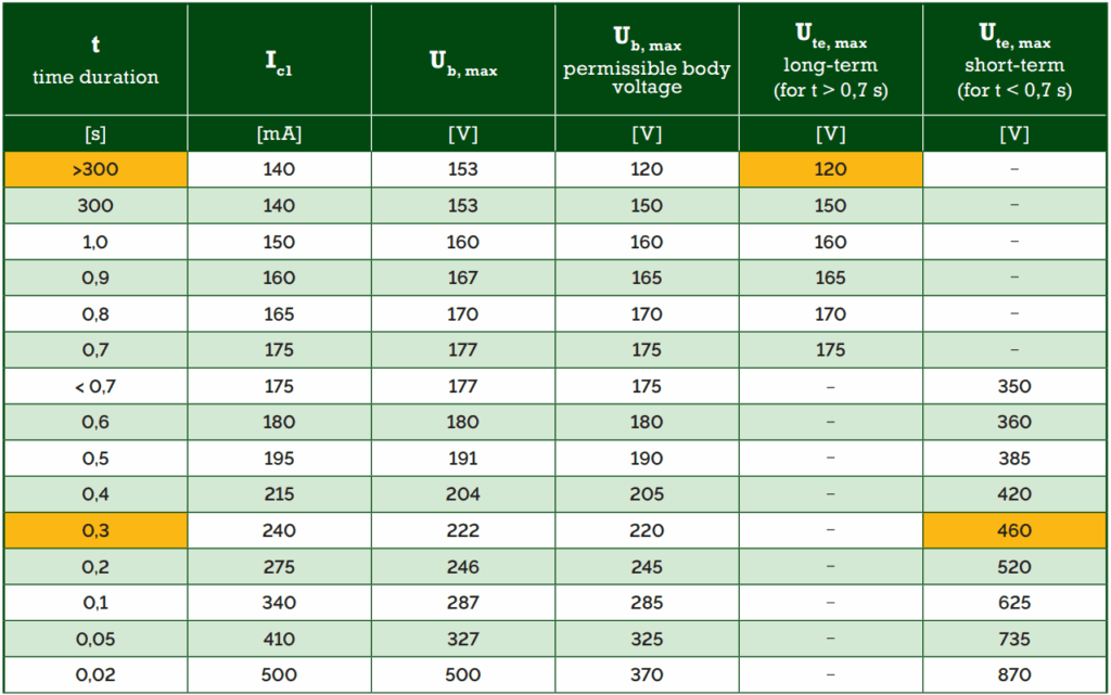 In general, the shorter the exposure time, the higher the amplitude of the touch voltage can be. This relationship is specified in EN 50122-1 in the table 1 below (this applies specifically for DC touch voltages).