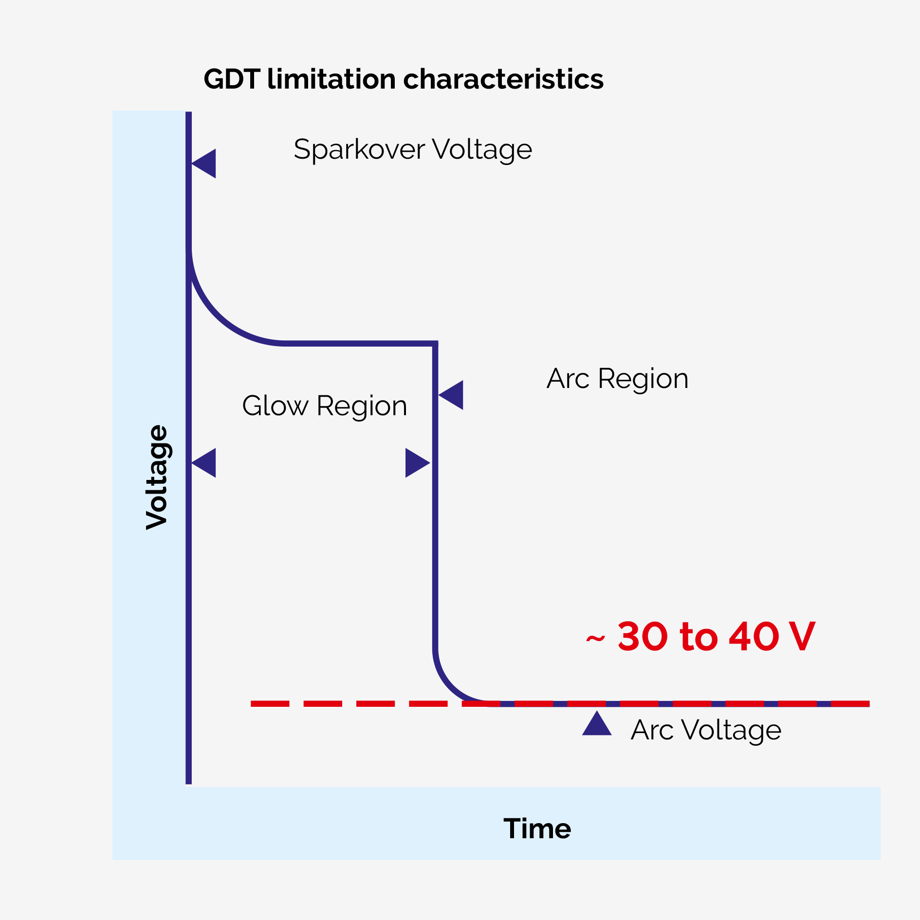 failures and damages that can be clearly attributed to improperly installed VLD-Fs designed on the basis of gas discharge tubes (GDT). The crux of the problem lies in the combination of the behavior of GDT at different voltage levels. The following figure shows a typical limiting characteristic of a GDT: