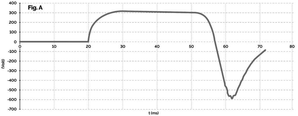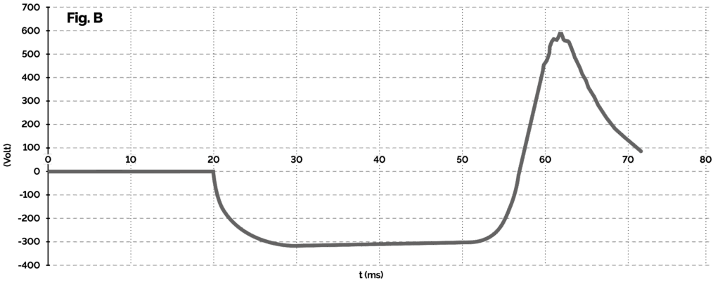 However, caution should be exercised when applying VLD class 2.1 in situations where longer pulses (i.e. longer than approximately 1 ms) of both polarities can be expected on the return conductor. This means in situations where the OCL falls, the insulator short-circuits, during energy recuperation, in locations far from the substation, etc. Let us show the reasons for this statement with an example – the situation of an OCL drop and the reaction of traction to a short-circuit current. The class 2.1 VLDs available today have integrated high-energy varistors, which have two tasks. One is functional, i.e. to react quickly at the moment of a highvoltage pulse by switching on and limiting the touch voltage, and the second is protective, i.e. to protect electronic circuits and power thyristor in the class 2.1 VLD from highvoltage pulses. At the moment of a fault, the varistors react immediately and with a certain delay (typically around 1 ms) the thyristors then take over the short-circuit current. In the case of class 2.1 VLDs, where only a single thyristor is installed, only the varistors take over all the energy load in the reverse voltage direction. This can cause them to be overloaded to the point where the VLD is irreversibly damaged. See typical envelope of rail voltage against earth at short-circuit place (fig.A) or at substation (fig.B).